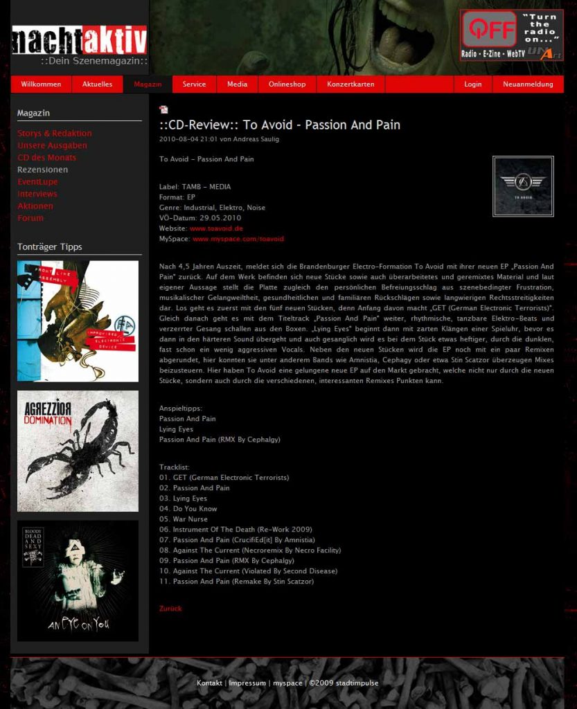 Nach 4,5 Jahren Auszeit, meldet sich die Brandenburger Electro-Formation To Avoid mit ihrer neuen EP „Passion And Pain“ zurück. Auf dem Werk befinden sich neue Stücke sowie auch überarbeitetes und geremixtes Material und laut eigener Aussage stellt die Platte zugleich den persönlichen Befreiungsschlag aus szenebedingter Frustration, musikalischer Gelangweiltheit, gesundheitlichen und familiären Rückschlägen sowie langwierigen Rechtsstreitigkeiten dar. Los geht es zuerst mit den fünf neuen Stücken, denn Anfang davon macht „GET (German Electronic Terrorists)“. Gleich danach geht es mit dem Titeltrack „Passion And Pain“ weiter, rhythmische, tanzbare Elektro-Beats und verzerrter Gesang schallen aus den Boxen. „Lying Eyes“ beginnt dann mit zarten Klängen einer Spieluhr, bevor es dann in den härteren Sound übergeht und auch gesanglich wird es bei dem Stück etwas heftiger, durch die dunklen, fast schon ein wenig aggressiven Vocals. Neben den neuen Stücken wird die EP noch mit ein paar Remixen abgerundet, hier konnten sie unter anderem Bands wie Amnistia, Cephagy oder etwa Stin Scatzor überzeugen Mixes beizusteuern. Hier haben To Avoid eine gelungene neue EP auf den Markt gebracht, welche nicht nur durch die neuen Stücke, sondern auch durch die verschiedenen, interessanten Remixes Punkten kann.